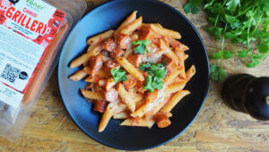 Vöner-lastuja miedossa kastikkeessa retkikeittimellä